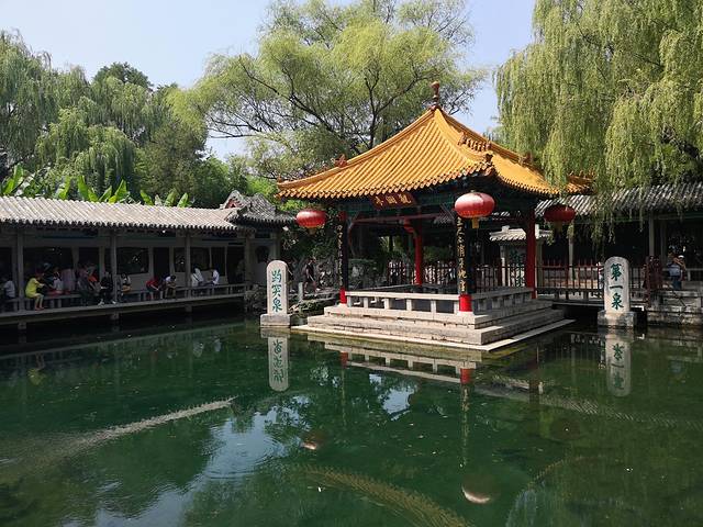 在济南的第二天上午,我们来到著名的天下第一泉——趵突泉。其实从南门进入后只要沿着中轴线走,马上就能够见到该泉水,但我们从东边的沧园进入,逆时针转了一圈才最终来到心中真正的目的地。看着从下而上冒出的三股细小泉水,在超高温的催化作用下,心情难免失望。当时让我印象最深刻的,莫过于在旁边喝下去的、据说是泉水泡制而成的茉莉花大碗茶了把,虽然它也是热的。