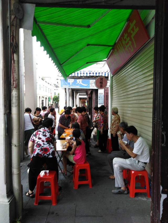 在一座牌坊边上,有当地人在煮绿豆沙,免费分给路人吃。