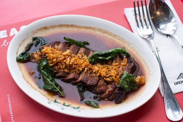 餐厅的菜单上的罗勒叶牛肉炒饭,与其他餐厅不同,通常其他的餐馆会直接将罗勒叶盖在米饭上,但是Easy Buddy将罗勒叶与米饭混合使米饭具有强烈的香气。首先,我们去的时候都喜欢先来一份招牌的开胃菜,“三文鱼生鱼片配辣味海鲜酱冰淇淋”,冰的泰国海鲜蘸酱看起来很像冰淇淋但仍然是其原始的味道, “五香烤牛肉舌“与 腌辣椒酱“搭配起来口感也是十分柔和。