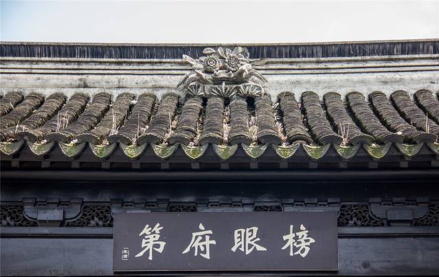 榜眼府第是冯桂芬故居,屋脊上有“一只螃蟹两朵菊花”的雕塑,古代科举考试中代表着“一甲第二名“的意思,也就是榜眼,所以冯桂芬是榜眼也就不言而喻了吧。