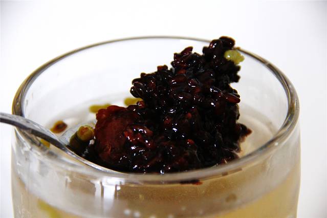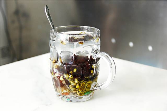 我们点了血糯米绿豆汤,里面的基础配料包括绿豆、血糯米、芸豆、蜜枣、冬瓜糖、红绿丝,实在是超出了我的想象,且绿豆汤中添加了薄荷,口感比一般冰镇的绿豆汤更加清凉。第一口便让我爱上了,以至于一天喝了三大杯,发在群里给众多小伙伴安利,苏州本地的一个同学说下次来她要请我喝到饱,心里小窃喜~