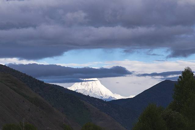返程时已近傍晚,在小路上兜兜转转,偶然看后视镜,贡嘎就这样出现了