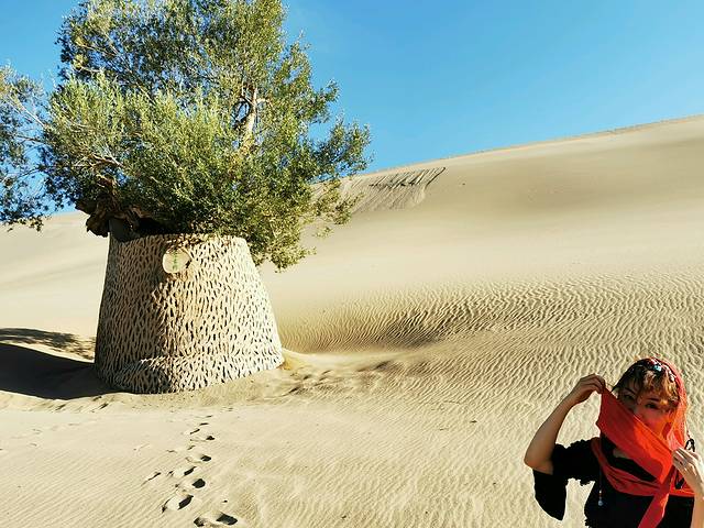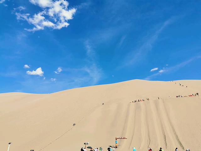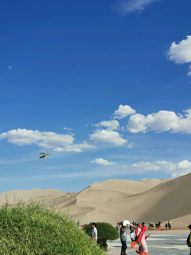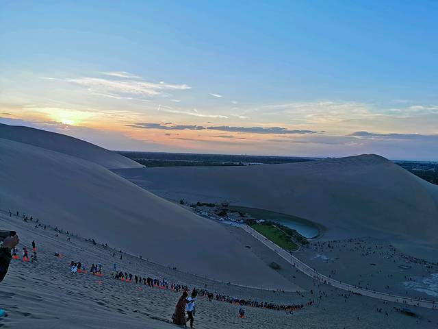 到鸣沙山月牙泉可以沙漠露营,篝火晚会,夜观星空,体验的是一种的城市里无法体验的美妙感受,缺点是住宿实在不行,我闺女就喜欢住大酒店,所以就不驻沙漠了。中午在酒店发个朋友圈休息一下,下午五点出发去鸣沙山月牙泉,去早了太阳太晒。从酒店步行十多分钟就到鸣沙山月牙泉,阳光很强,人很多。我们先去月牙泉,计划等晚上8点开始爬鸣沙山看日落。