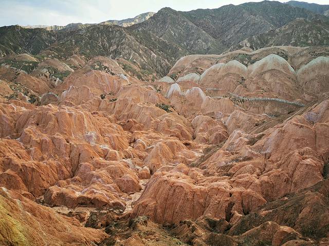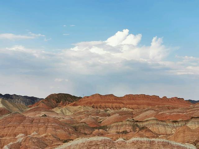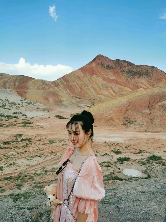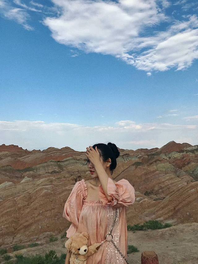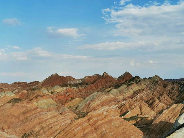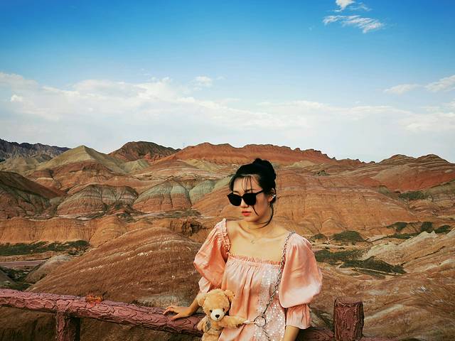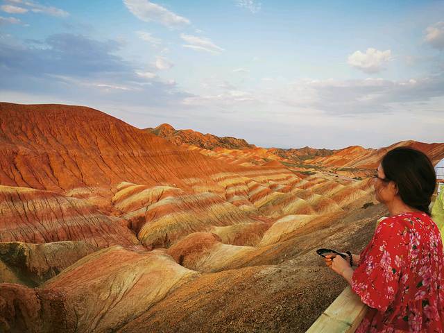造型奇特、色彩斑斓而称奇,有红色、黄色、白色、绿蓝色,色调有顺山势起伏的波浪状,也有从山顶斜插山根的,犹如斜铺的彩条布,色彩异常艳丽,像被上帝打翻调色盘,让人惊叹不已。七彩丹霞位于张掖,河西走廊,一般是人们西北大环线必游之地。张掖从前并没有多出名,人们也并不知道在这里藏着一个老天爷给的恩赐。后来张艺谋在此处了拍了《三枪拍案惊奇》,才真正将这里的风景带入了人们的视野。如今这里一到旅游旺季便人山人海。七彩丹霞如果四个观景台都游览的话,大概需要两个小时,虽然观景台之间有区间车,但是上山下山还是相当消耗体力的,强烈建议姑娘们穿好运动鞋涂好防晒霜。我们是下午5点开始进景区的,太阳刚好不晒了,玩到8:30太阳落山,落日余辉有日照金山之美。