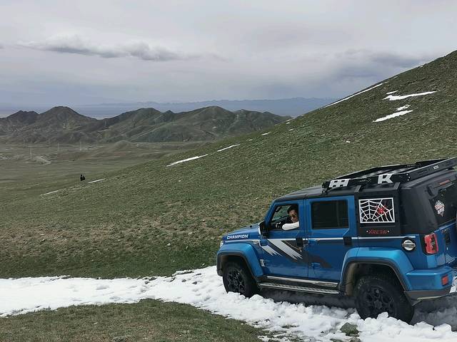 到了当今山,已经是从青海进入了甘肃地界。当金山北坡陡峻,南坡相对平缓,我们就从南坡直接开上去,开始还有一段小路,后来就完全没有路了,越野车完全是在山地上跑,直至跑进山顶雪线。越野车从山上跑下山也很刺激,只是夫人的小心脏受不了,一度嚷嚷着要下车自己走下山。