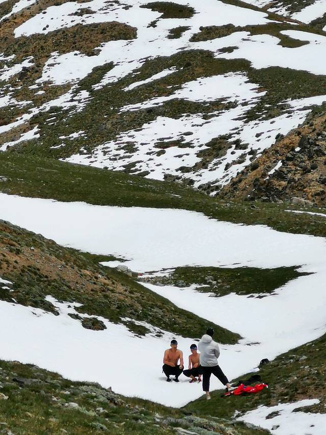 远处山谷有两个勇士光着上身在雪地上摆拍,真是一道靓丽的风景线。