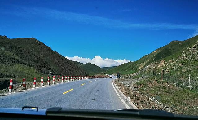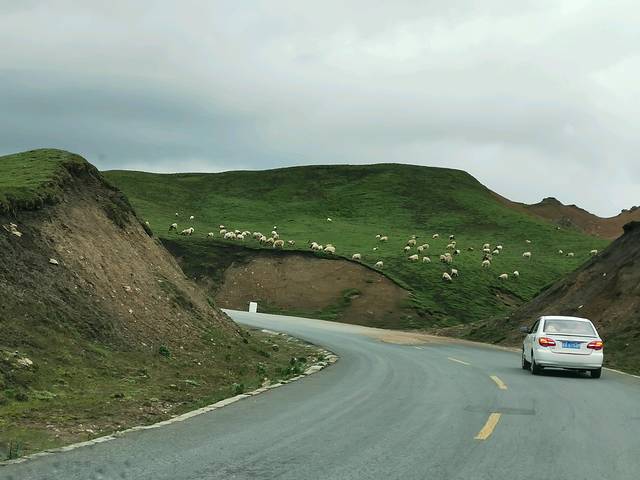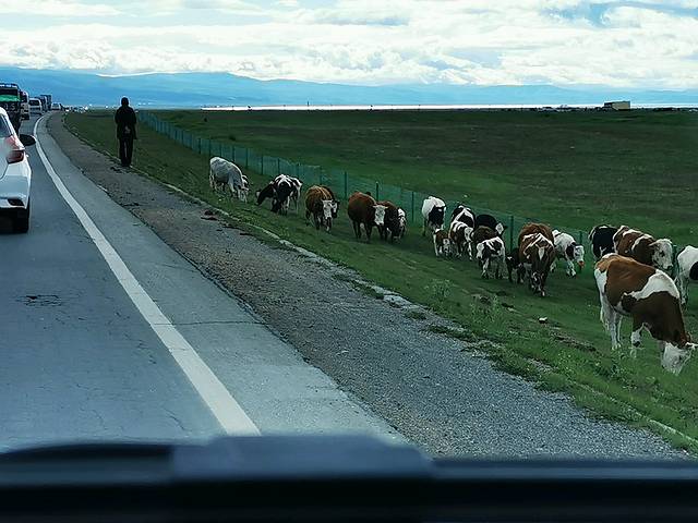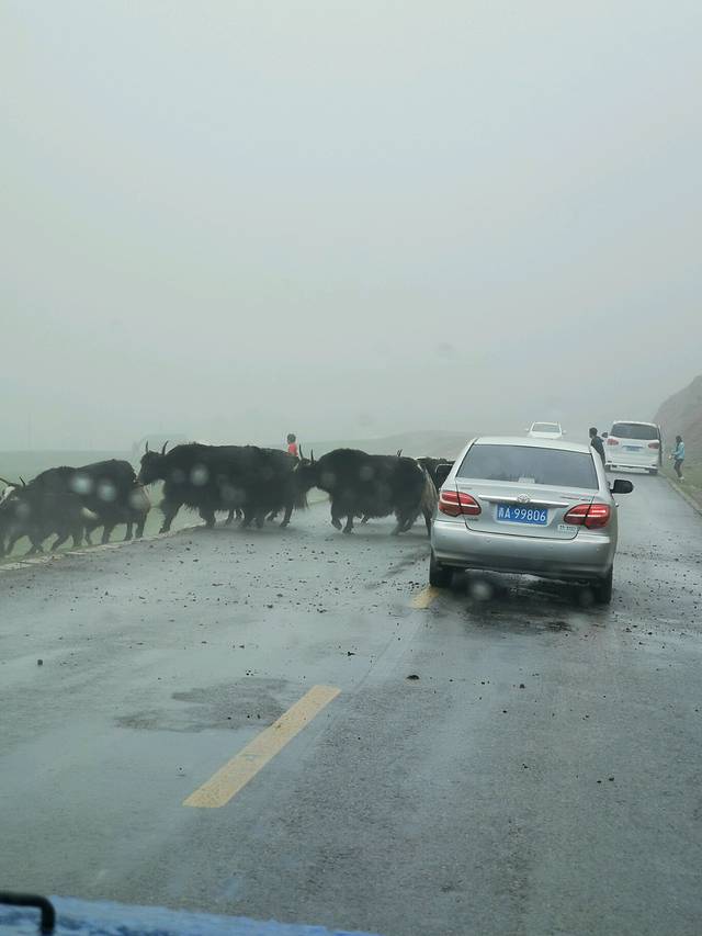 路上偶尔会遇到羊群或牦牛群过路,驾车可得小心通过,听小马师傅讲,一头牦牛1万块,撞死了要赔3万,因为要将其后代都算上。
