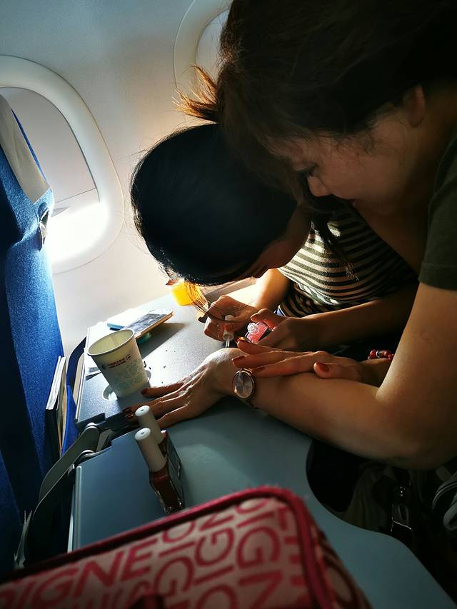 烟台飞西宁。飞机上闺女用心帮妈妈涂指甲油,多贴心的小棉袄呀,所以养闺女是一件多么幸福的事情。