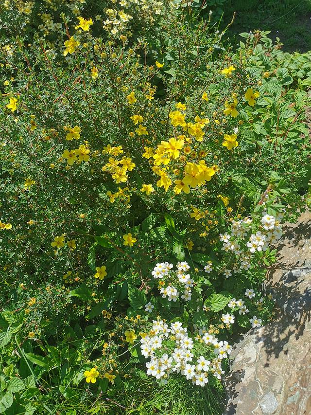 河边有一丛丛的小花,有点像蔷薇,也有点像梅花,形色了一下,黄的叫金露梅,白的叫银露梅。