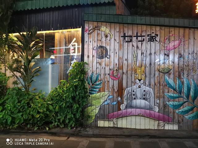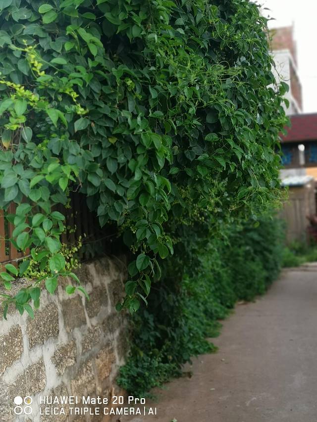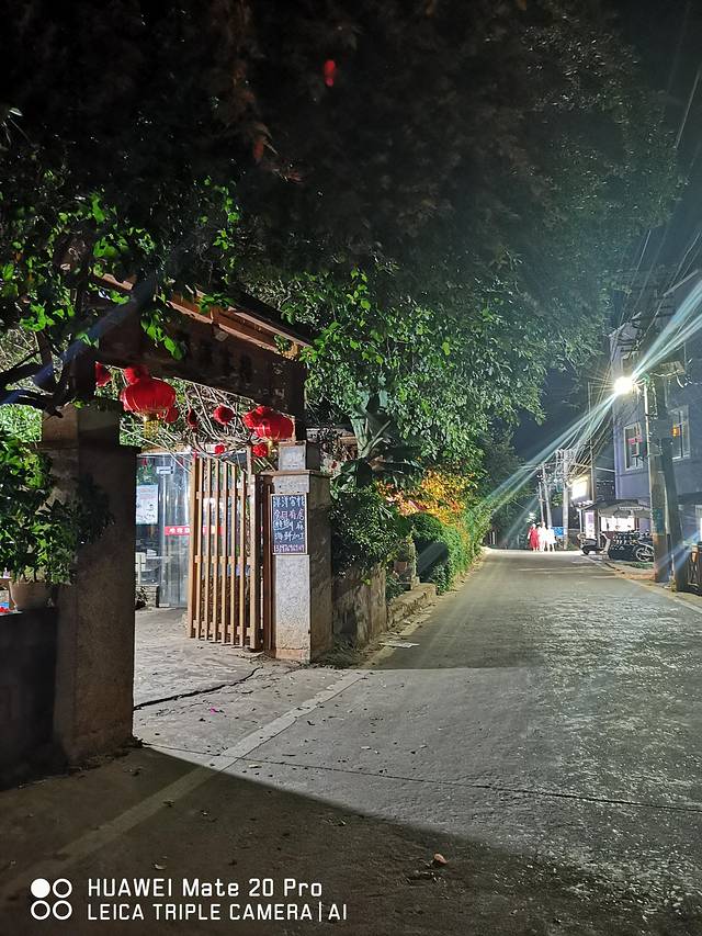 大概是因为游客们白天都玩累了,岛上的人们也要收拾好忙碌了一天的疲惫状态然后为第二天的继续努力而做好准备。晚上11点的村子显得格外宁静。白色的路灯照在水泥路上,偶尔有一两个人从我们身边经过。路旁的围墙上爬满了绿色的藤状植物,给人一片清凉的视觉享受。然而,最引人注意的还是路边的几处院落。