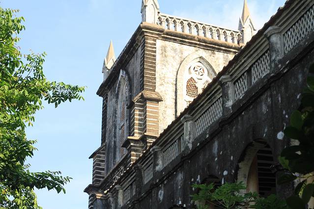 一眼望去,教堂掩映在一片绿影婆娑的芭蕉林和菠萝蜜林中,这是典型的文艺复兴时期法国哥特式建筑,在四周低矮民居的衬托下,显得气势宏伟。高耸的罗马式塔尖让人产生了一种“天国神秘”的幻觉。