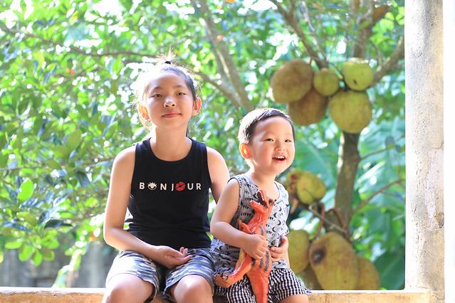 从教堂侧门出来绕回正门的旁边,有一个不显眼的石阶,沿着石梯走进去,居然有一个很敞亮的走廊,或许是入口比较隐蔽的原因,我们走进来时,这里竟然没有其他人。孩子们很兴奋,尤其是小猴子,拎着他的恐龙跑来跑去,很快就和姐姐爬上了走廊的围栏上。我站在孩子们的对面,阳光洒在姐弟俩的脸上,背后树影婆娑,这个画面真是美得不可方物,我赶紧向余先生示意,用相机留住了这珍贵的瞬间。