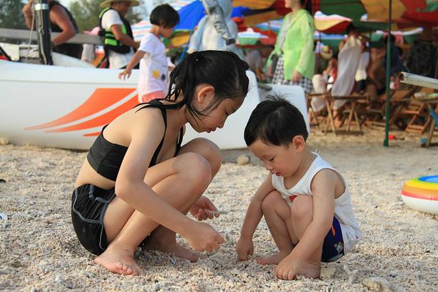 海岛旅行,最不能放过的自然是海滩,岛上有名字的海滩都罗列出来,让孩子们挑选,姐姐代表小猴子首选了贝壳沙滩,原因是他们认为那里一定能捡到很多的贝壳,当然,后来的结果证明了的确只是他们以为。不过孩子往往没有大人们那么要求高,只有有好玩儿的东西,他们可以忽略所有外在恶劣环境产生的不适感,比如接近四十度的户外高温和能让裸露皮肤脱皮的火辣辣的太阳光。