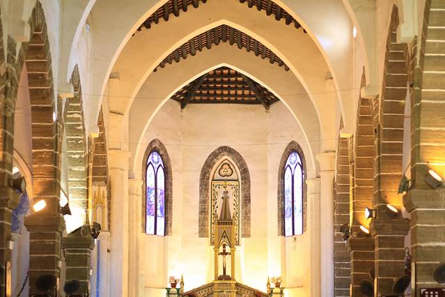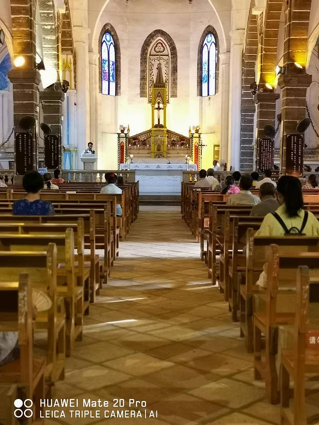 教堂是无比庄严的地方,走进教堂的每一个人,都必须做到不戴帽、不露肩、不露脚、不玩手机、保持安静,这是对信仰最起码的礼仪和尊重。无论是谁,当脚步踏进祈祷大厅,都会自觉地融入这种安静严肃的氛围里。我们进来时,一位牧师正在为教徒们讲道,坐在下面的教徒不算多,但每个人都在很认真的聆听“天主”的教诲。我找了一个紧挨过道的位置悄悄坐下来,生怕打扰了他们,我不是天主教徒,但我尊重所有虔诚的信仰。此时,明媚的阳光穿过墙上圆拱的彩色玻璃窗,犹如天国的圣光,使教堂内显得绚丽多彩。