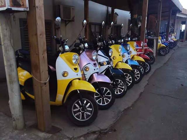 比起其他很多景区,涠洲岛的设施相对比较落后一些,但公路还算宽敞平坦。岛上的交通工具主要是三种:观光车、三轮车和摩托车。观光车适合一大家人或者旅行团使用,三轮车刚好适合我们这种两个大人带着小孩儿的家庭,而电动摩托车就更适合三五成群的年轻人朋友或者情侣使用,没有太高的技术要求,胆儿大的人一学就会,岛上随处都能租到,交点儿押金,两人一起或者独自骑行,跟着地图想去哪儿去哪儿,悠哉悠哉,好不自在!