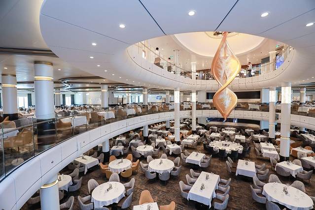 海洋光谱号创新地将4间独立餐厅合并为一间三层挑高、可一次性容纳多达1836人就餐的盛宴式免费主餐厅。每日提供的不同中西式菜谱都将是最佳用餐选择