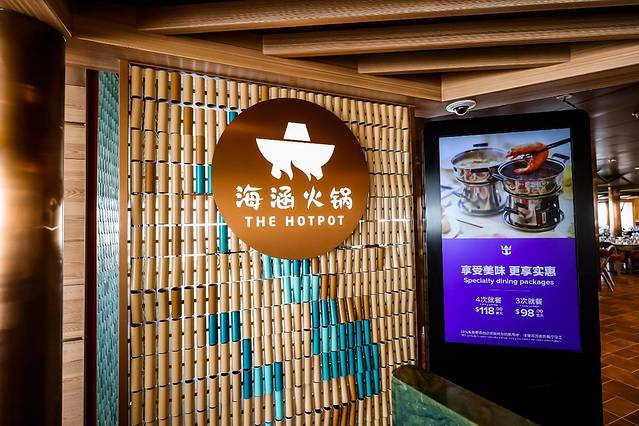 海涵火锅餐厅,坐落于甲板14层,可容纳168人同时就餐,在这边还可以尽享可船尾270度无敌海景。这里提供不限量供应的新鲜肉类和海鲜,佐以或清淡鲜美或热辣浓郁的汤底,配合各种自取调料