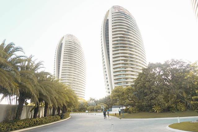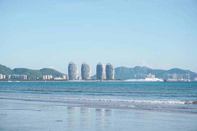 以前来过三亚,在鹿回头景区鸟瞰了整个凤凰岛的风光,印象最深的是那5个呈椭圆形的大厦。以鹤立鸡群的形态展现给我们,成了三亚的地标了~于是这次就有了想近观一下的冲动。凤凰岛是一个人工岛屿,位于 三亚湾 “ 阳光海岸 ”的核心区,始建于2002年,占地面积1258.8亩。因为凤凰岛四面临海 ,所以只有一座跨海大桥与 三亚市区连接。