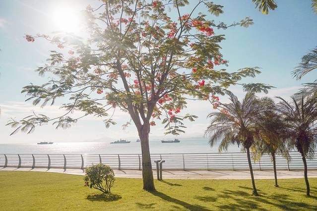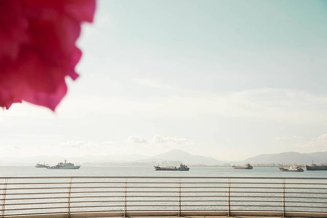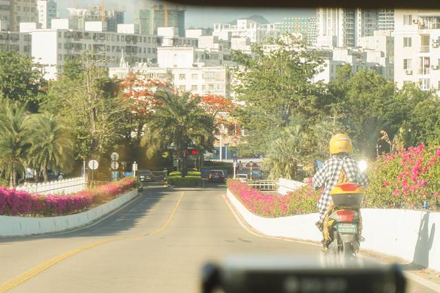 想要从市区到凤凰岛,唯一 的通道就是这座桥了,桥两边种满了三角梅,一路上还可以看到蔚蓝的大海。这条充满春天气息的道路,真是让人心情愉悦。