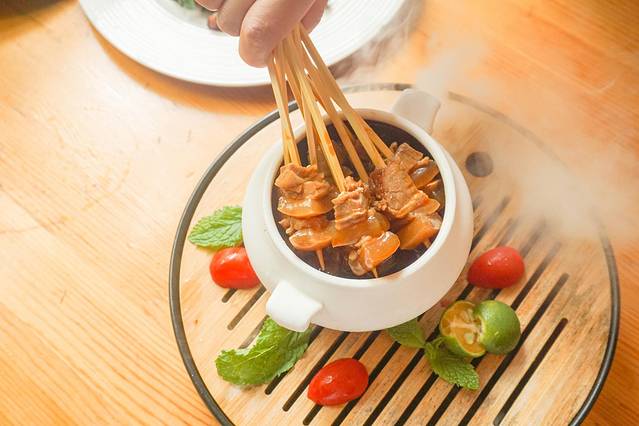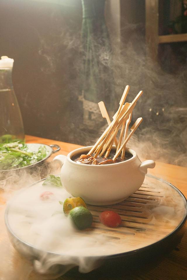 小黄牛端上来的时候就是仙气缭绕,所以就叫做云游七仙岭的小黄牛吧~有点类似钵钵鸡的做法,拿长长的竹签串着,浸泡在汤汁之中,上面还飘散着白芝麻。其实它是一道冷菜,肉质很有嚼劲,超级饱腹。