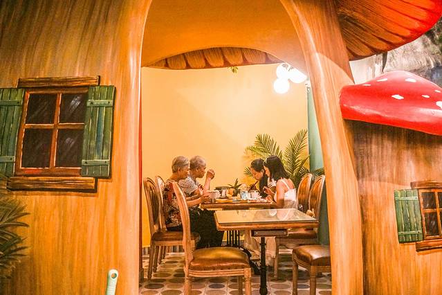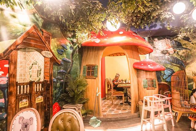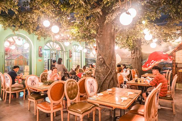 除了餐厅外面给人惊艳的感觉,餐厅里面的装饰也让人耳目一新。那诺大的绿树伫立在餐厅中央,就像是走进了热带雨林之中。还有那朵红色的蘑菇!我像是拥有一颗猎奇的心,想把它采摘下来放在兜里然后带回家!但是,仔细一看,原来这是一个房间,坐在里面的都是正在享受美食的顾客。这新奇的设计不得不让我佩服设计师的创意。