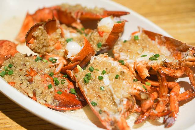 和服务员聊着聊着,菜也上了。这个清蒸大龙虾的上面铺满了青葱还有蒜末,乳白色的龙虾肉肥美鲜甜,连平时不喜欢大蒜的我第一次觉得这道菜没有违和感。真真实实的保留了虾肉的本质味道。
