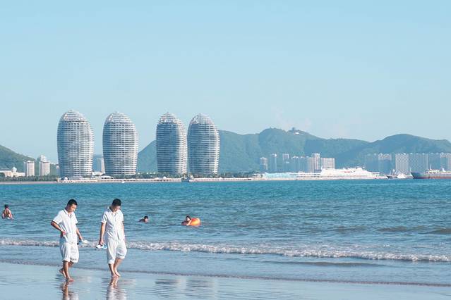 在三亚湾边走边踏浪