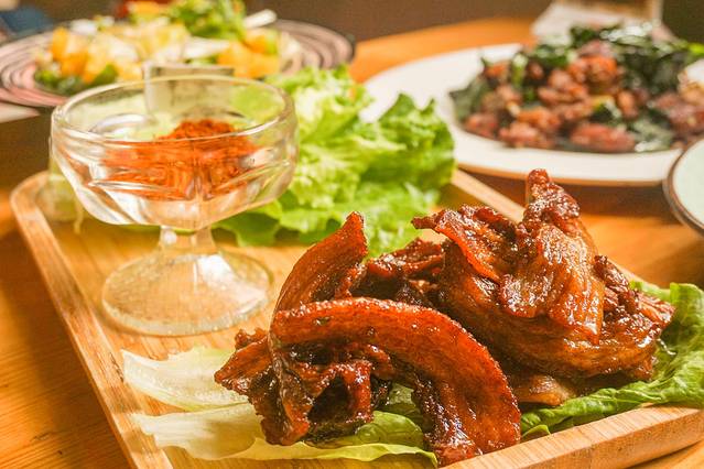 恋爱中的五花肉,听起来这么甜蜜的名字。可以单着吃肉也可以用生菜包裹着肉肉再蘸上辣椒粉末吃,酥脆中是酸甜辣,所以给人一种恋爱的赶脚。
