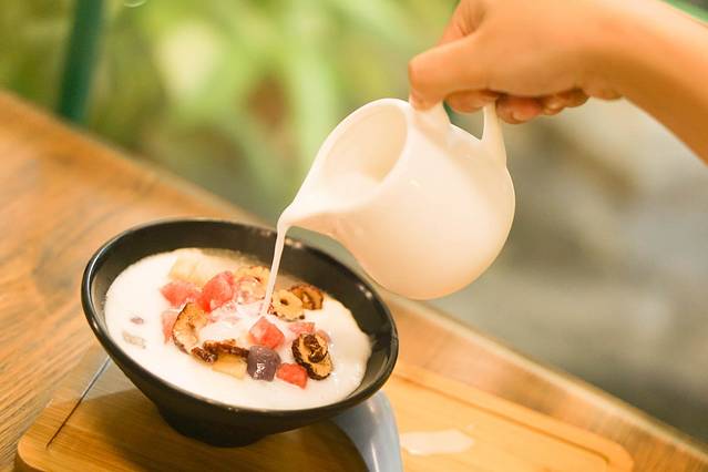 我还点了一些本地特色的美食,就像是清补凉,也是我来海南一直想吃的小吃,有点类似芋圆烧仙草的美食,各种配料,薏米红枣小芋圆葡萄干西瓜凉粉等等多达十多种食材,搭配着椰奶......浓郁奶味之中是脆口清爽,