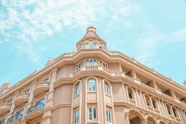 米白色的墙体上都有精致的雕花,镂空的栏杆阳台,粉色尖尖的屋顶~处处让人应接不暇。