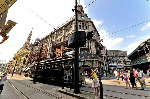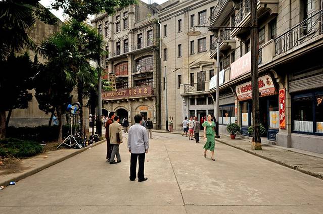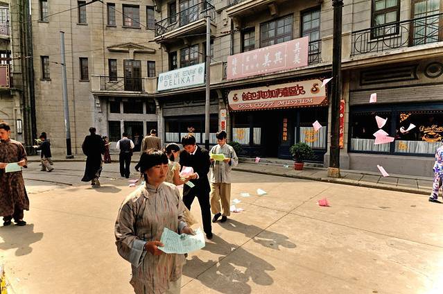 松江影视乐园早已名声在外,基本上涉及老上海的影视剧都会来这里拍摄。所以,如果人品还可以的话,你基本都是可以遇到剧组拍摄的。上面这张就是老掉牙的桥段:街上到处都是空中撒下的传单,日本宣布无条件投降了,人们相互庆贺。