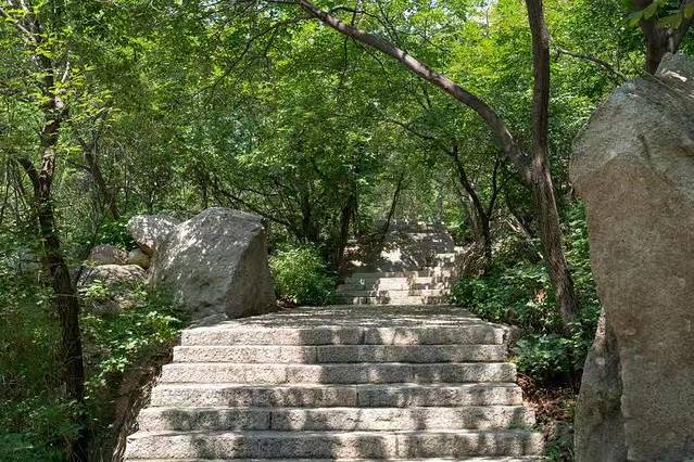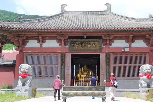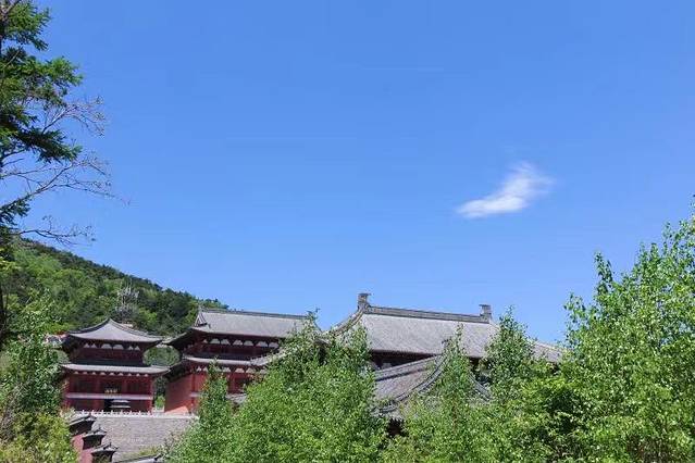 不一会,索道下面出现了高高的红色围墙,和在阳光下莹润透亮的汉白玉台阶。不似刚才画廊谷嬉水的惬意,山海禅寺的明清遗留古建筑让人肃然起敬。
