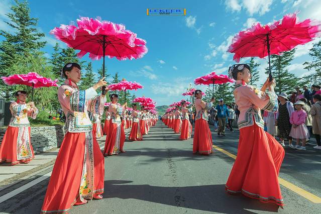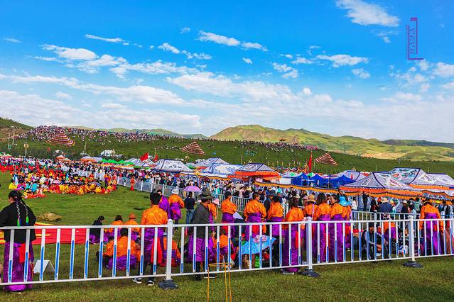 大家对翌日10点半开始的当周草原大型演出很是期待。早晨8点,背着摄影包坐着公交车抵达演出场地的入口。从入口到演出主席台足足有两三公里长,沿途甘南各县组织的民众,身穿民族节日盛装,载歌载舞欢迎四海宾朋,场面十分热烈;演出场地两边的山丘上,已经密密麻麻坐满了人,远远望去,五颜六色的伞组成的“星阵”,在蓝天白云衬托下,貌似放大版“银河”绚丽多彩;左右两边山丘之间的草地上,各种色彩斑斓的大小帐篷,细看方知是甘南各县演员以及工作人员们的营地……整个当周草原,不啻为九色甘南香巴拉现实缩影版!