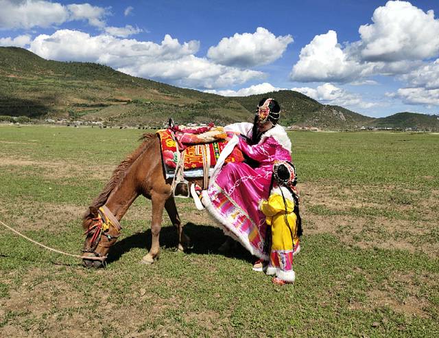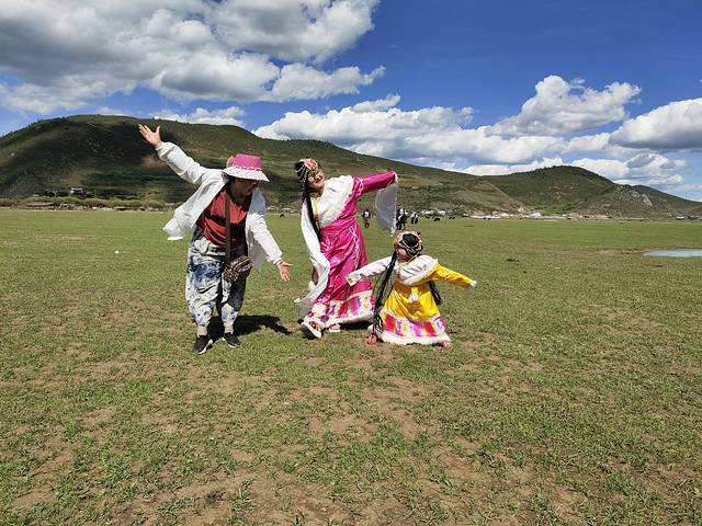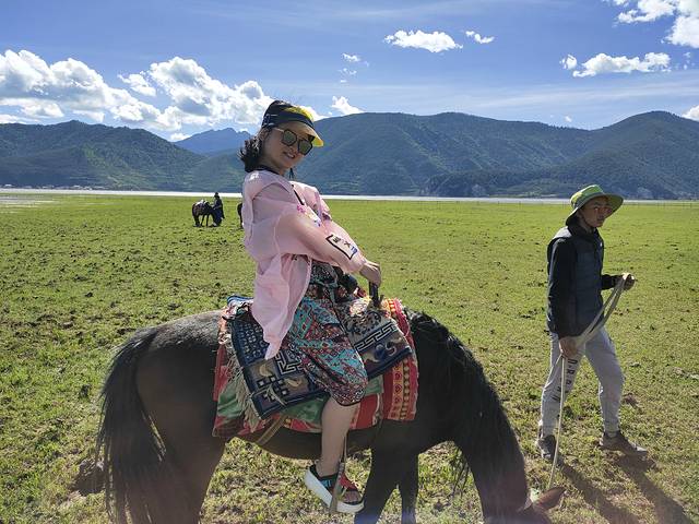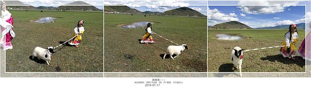 骑马我们选得是B线路,160元一人马上行程一个半小时,到达景点拍照时间随我们心情而定。租藏族服饰和小羊羔拍照共40元。小羊羔挺可爱,开始让小糯米去抱,她不敢。过了没多久她就牵着到处跑,可小羊羔不听使唤:经常不是停下来喝水吃草就是跟她往相反方向跑与她成对抗之势。我们在草原上边唱边跳放飞自我,玩得不亦乐乎。