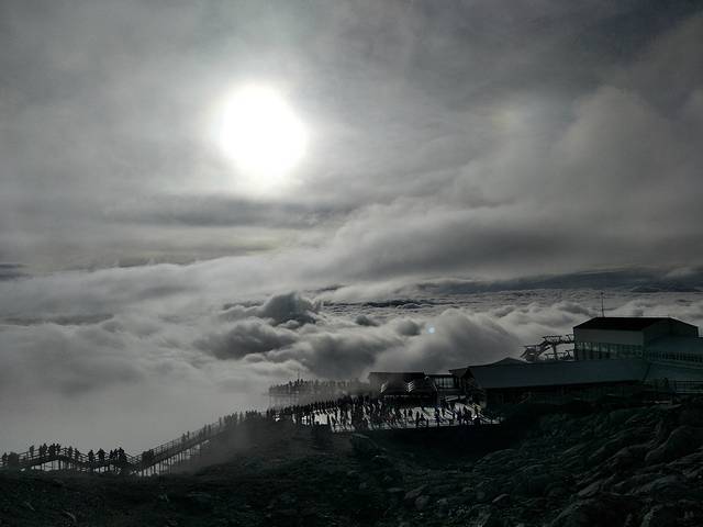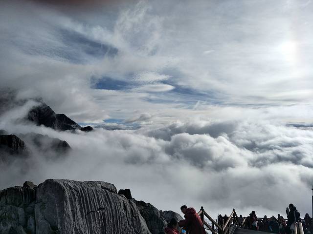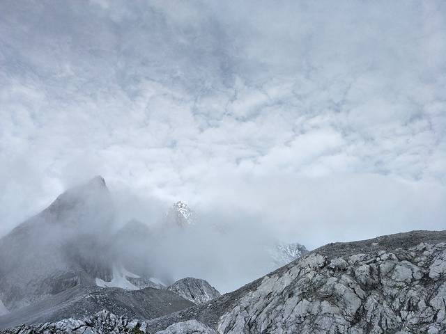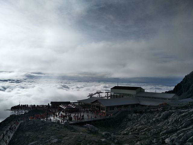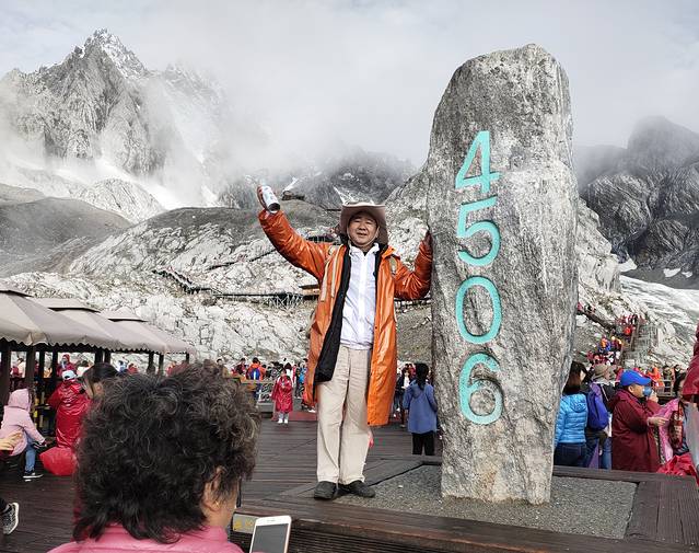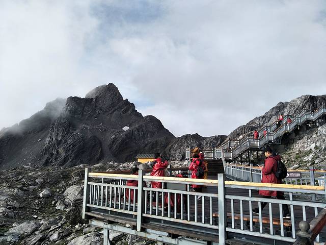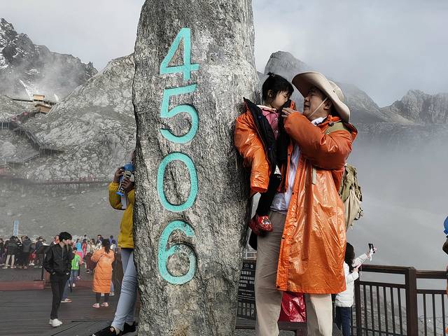 这次去玉龙雪山我是有遗憾的!我们报得是玉龙雪山大索道+《印象丽江》的商务小团,为了赶早,五点半就出发了,到达雪山居然发现还有比我们更早的。在大索道下行入口时,司机跟我约定好是8点10分到停车场集合。大索道一直把我们送到海拔4506米的观景平台。小糯米觉得想睡觉又不会吸氧,所以有些小小的高反。只好把她留给爸妈照看,我独自登顶,当时时间7:50。我不管不顾地一路狂奔,跑得我汗流浃背,防寒服和背包贴在背上湿漉漉的很不舒服,真想把它们甩掉。越过4590米的标志时,我突然感觉到空气的稀薄,脚底千斤重,之后一步一艰难,看了下时间已经到了8:05,我担心继续登顶再下来会严重超时,所以只好在4600米左右时一步三回头地折返。