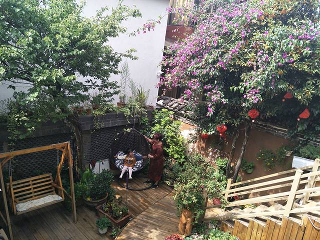 今天的旅游计划只有木王府,所以我们睡到自然醒,在居住的小院子里喝茶、荡秋千。上午十点钟左右才出得门,顺便在去的途中联系好去香格里拉两日游的商务团行程。(其实这次我是想去泸沽湖的,为了解“丽宁十八弯”我特意看了《千里走单骑》,我爸有些晕车,小糯米又小;香格里拉也犹豫的原因是那里平均海拔3300M,普达措公园3500M,而且在那边一待就是两天,我担心我爸和小糯米会有高反。所了我一直在心里反复琢磨到底去泸沽湖还是香格里拉?最后听完旅行社工作人员详细介绍后,选定了香格里拉)