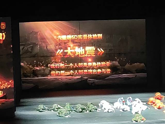 《丽江恋歌》的演出,在最后砸开山石引下洪水救下全村人民的那一刻刚好整个丽江的雷电不期而遇,倾盆大雨隆重登场。正好我们进入《丽江千古情》的演播厅