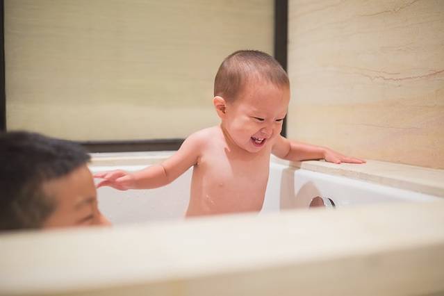 这个没见过世面的娃,在泳池里崩溃了,只能在浴缸里称霸,回到房间就想去浴缸里玩。有点后悔家里没装个浴缸。