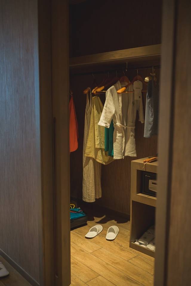 珊瑚酒店:房型不一样,大小区别还是挺大的,观景阳台,同样的三分离,衣帽间、吧台、休闲椅,但大床房比椰林多了浴缸。双床房是没有浴缸的。两个酒店的浴袍和洗漱用品包装也不一样。