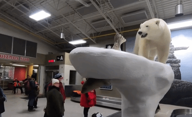 从埃德蒙顿转机去黄刀镇的飞机特别小,大概只能坐15个人,像一个直升飞机。本来担心一下飞机找不到导游,没想到黄刀镇机场也特别小,走扶梯下飞机,过个小门就是到达厅。到达厅只有一个行李转盘,上面有一个北极熊雕塑。一出来就看到一个小哥举着我名字的纸牌,本来想在他后面拍他开个玩笑,结果没拍成反倒被他开了个玩笑,这就是我的导游David——旅程的另一个收获。