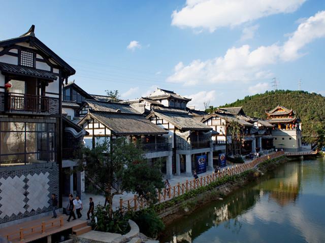 第四天我们从黄果树瀑布到了双龙镇,开车花了2个小时左右,双龙镇位于贵阳市南明区龙洞堡与黔南州龙里县的交界处,因而得名“双龙”,我们在双龙古镇里面逛了一下,我们当时去的比较早,镇上都没有多少人。古街道一旁是个小小的游乐场,另一旁是古建筑,经营有特色菜、民族手工艺品,我们在街道这里一间牛肉店里吃干锅牛肉,乘着上菜的空档,索性去逛了一圈。古镇不大,10多分钟就逛完了,但是发现了两家比较有特色的咖啡店,在入口处一小湖边,冲动的要入坐,聆听喷水声,细品一盏茶,坐上一两个小时都不觉得多。