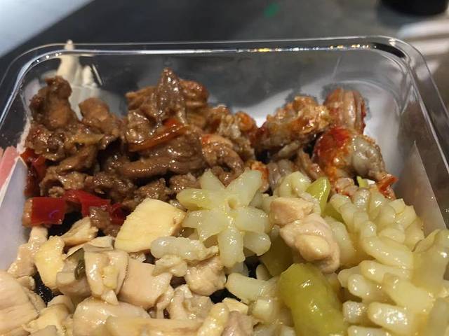有辣椒炒肉、口味鸡、鱿鱼还有小龙虾四个口味可以选,而且可以随便组合,创意有,口味也是真的很赞,价格也很便宜,组合一起才27元,感觉自己花27元吃了一道大餐~