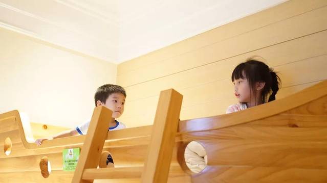 方方蔡蔡一看到这个船形状的儿童床,立即脱鞋子爬上去争着要霸占位置。