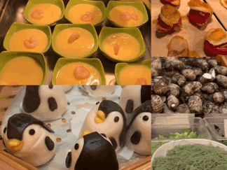 自助餐厅准备了孩子的专属美食和专属儿童餐具,方便孩子自如取餐,有鸡蛋面、蔬菜面、无盐水蒸蛋、企鹅包子、水煮鸡蛋等,方方吃得可香了。