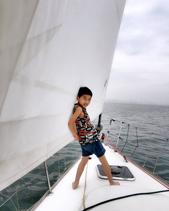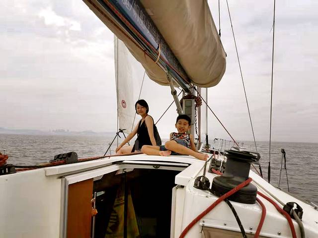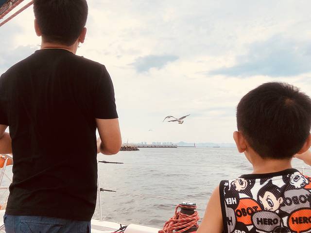 一艘帆船,一家三口,暖风拂面,海鸥伴行.....