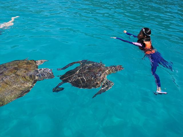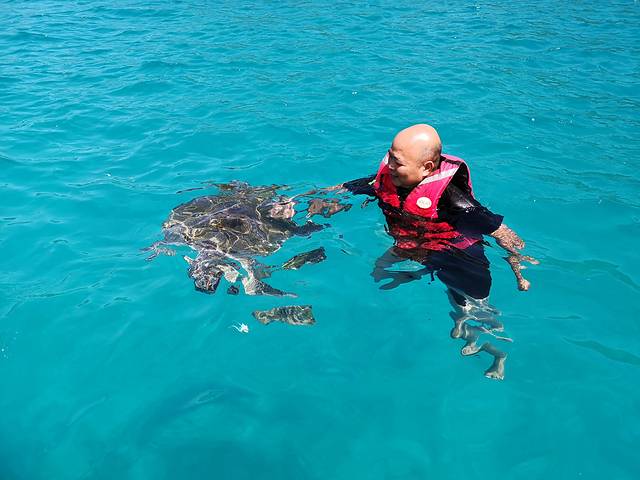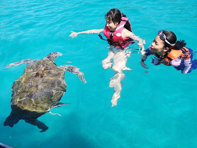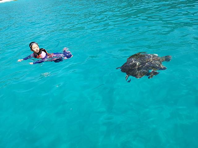 午餐后在房间稍作休息后就出海跟海龟游泳啦。莎莉浮潜部的工作人员特别交代我们不能在海龟面前伸手,不然它会以为是章鱼会咬人的,在它背后伸手都没有问题。