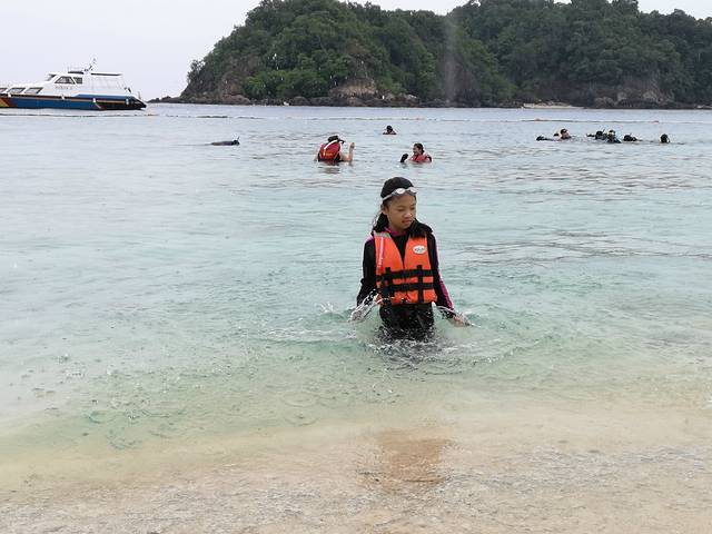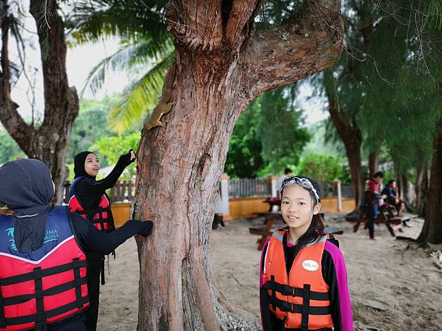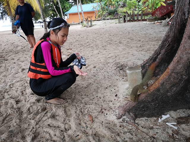 套餐中有一项是浮潜,安排在今天早上九点,早上起床后下起了小雨,浮潜的地方也让我有点失望,就是坐快艇到另外一座小岛上,在沙滩边上的海里圈出一块地方,两个小朋友玩了不到一个小时就嫌无聊了,倒是沙滩上的小松鼠让秋姐惊喜了一下。还是回度假村玩泳池吧。