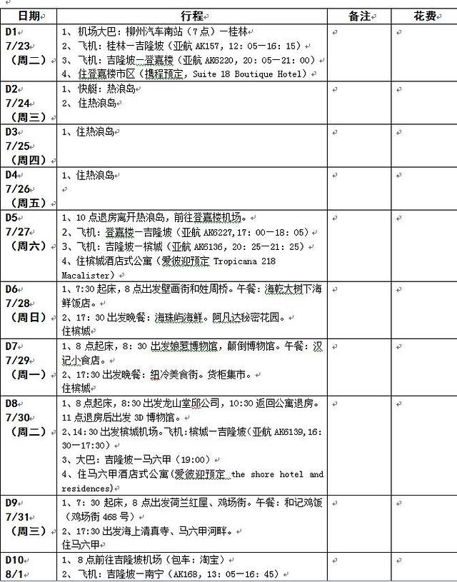 马来西亚在2016年1月去过一次,本不在此次出行的目的地选择之中,心心念念着寒假因为晚订而没有机位的美娜多,可就在准备跟旅行社订美娜多的自由行套餐时,看到了飞鱼旅行的热浪岛宣传,原来热浪岛就是19年前电影“夏日嬷嬷茶”的拍摄地,就因为这部电影,立马决定了今年暑假二刷大马!因为上次没有安排槟城和马六甲的行程,这次就把这两个地方一起纳入。我的高中同学莹带着儿子也加入了我们的团队。截图中是此次行程的安排,花费是人均5000元人民币。