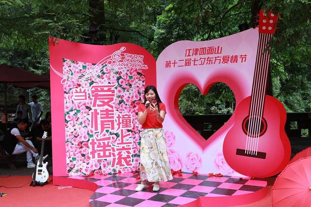 由于今年已是四面山举行的第十二届七夕东方爱情节,游客们早已慕名前往。8月7日当天,不少游客纷纷选择来到四面山知名景点——望乡台瀑布,参加“挑战望乡台”活动。火药团乐队以一首高昂的粤语歌瞬间带动现场观众热情,游客们争先上台与乐队积极互动,情歌对唱现场气氛火热。