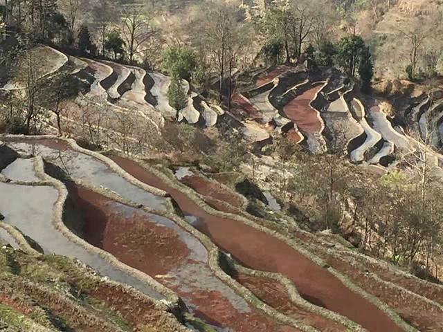 No.7,迎着普洱的朝阳又开始了今天的行程,先得说今天的早餐酒店竟然没有稀饭,头一回烫了两罐八宝粥下肚而她娘俩一人咥了一碗米线。途中路过一片香蕉园时丫丫竟然对路边的一丛分外着迷,原来她认为那是芦荟要和她妈妈研究研究,真是萌呆了!快到哈尼梯田景区时吃了哈尼同胞做的午餐,差点要了一盘“蜂蛹”,就是那个哈尼大婶在用镊子从蜂窝里挑出来的又白又肥的,最后还是没敢下口。哈尼梯田的景色不必多言,联合国非物质文化遗产的名头也足够拉风,不过我印象最深的还是形容其所在地“红河哈尼自治县”的一句话-云端古镇、梯田故里[强]。下午沿着214省道进入到玉溪境内后被路边连片的红色山丘所震撼,都说云南红土地物产丰富水果香甜,果是名不虚传。傍晚抵达玉溪华宁县,早早洗漱后我们吃着火锅唱着歌。